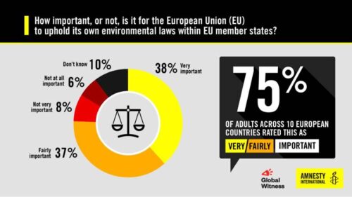 The new survey of 10,861 people – commissioned jointly by Amnesty International and Global Witness – also found that around three-quarters of respondents said large companies should be held accountable for human rights (75%) and environmental harm (77%) across their global value chains. The findings come at a time when the EU is considering drastically weakening environmental and human rights protections, with the European Parliament expected to vote on a range of laws that are part of the bloc’s rollback on the ‘Green Deal’ on 13 October.